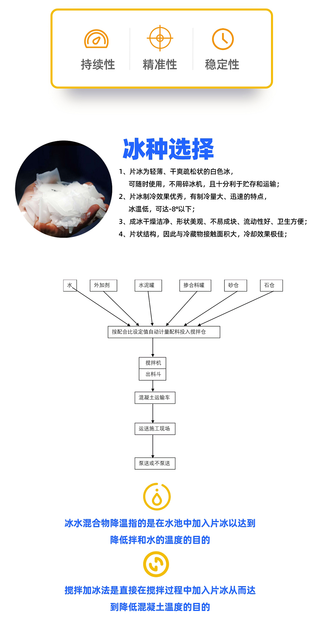 該系統(tǒng)通常具備自動儲存、抹平、出冰和有時還包括稱重功能,確保冰塊可以高效地被螺旋輸送機或氣動系統(tǒng)輸送到混凝土攪拌等作業(yè)點。