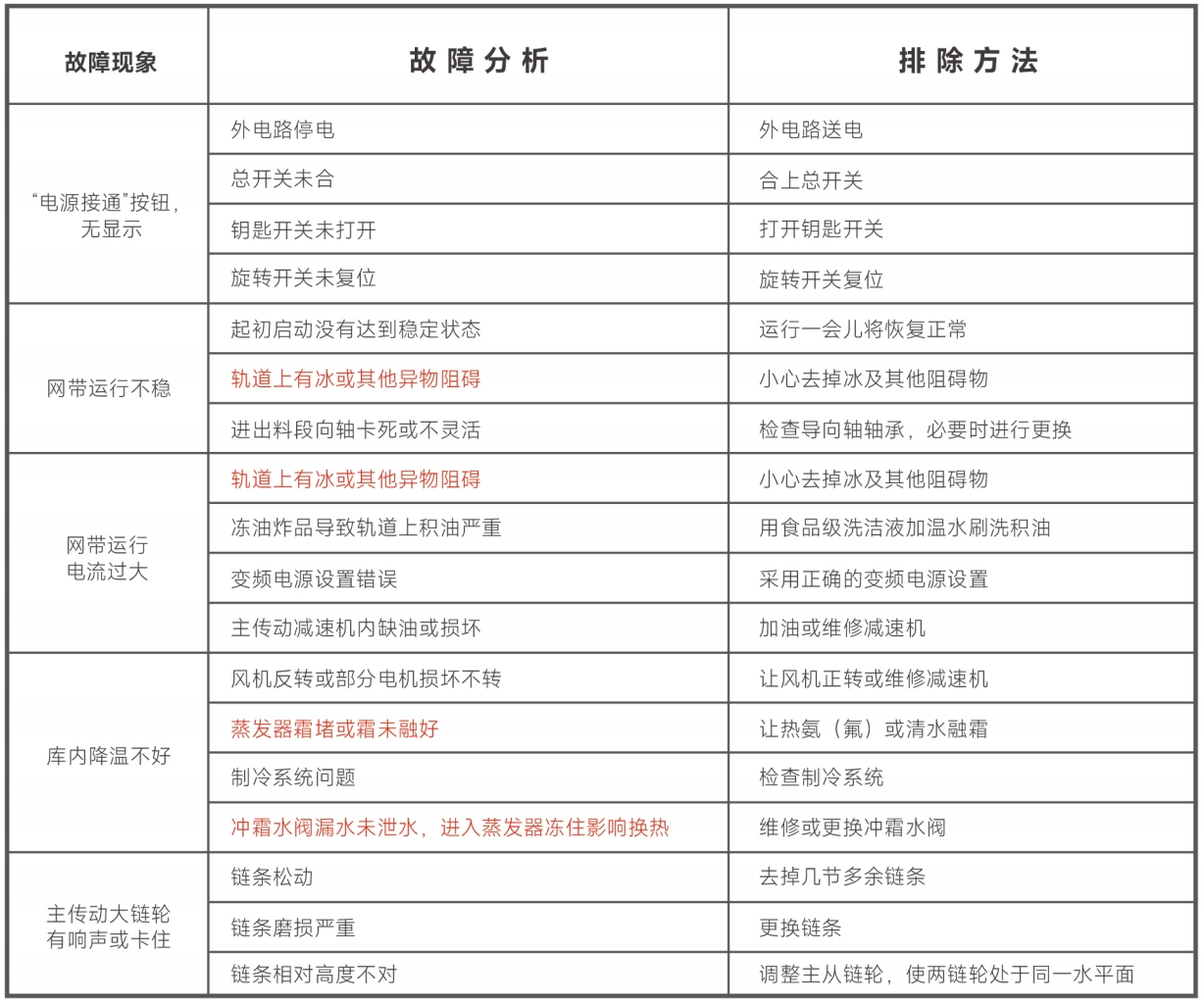 4.禁止當日工作結(jié)束或中途停機吃飯,保住庫溫,稍后或次日繼續(xù)使用,會導致網(wǎng)帶凍住,造成傳動電機電流增大和拉傷網(wǎng)帶事故。